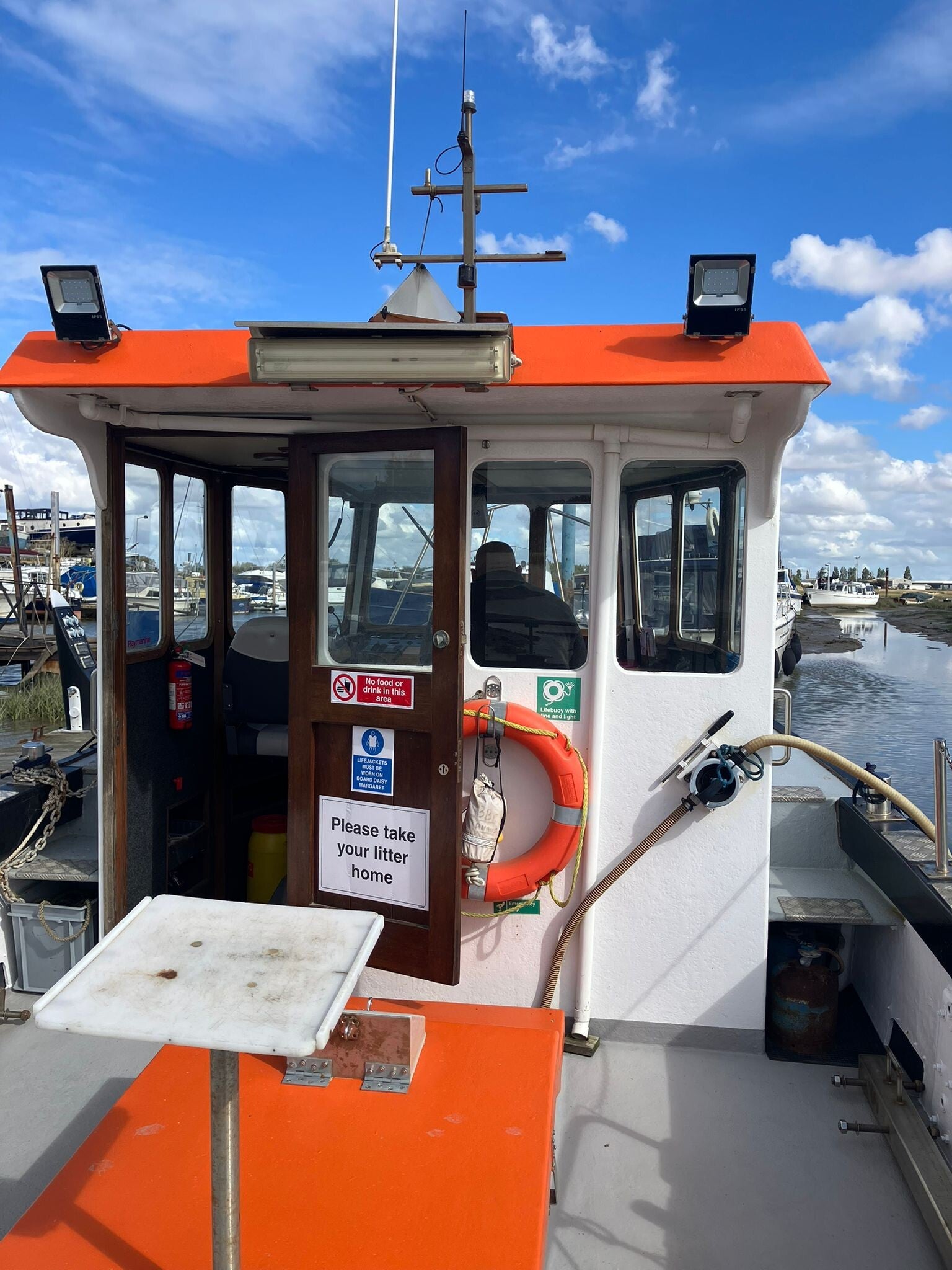She is safe with guard rails and all the safty equipment needed to ensure there are no unwanted stories to be told. With a cruse spped of 8 knotts, you will not be skipping along the water and will not need to hold on too much, just enjoy the ride aand take in the sights.